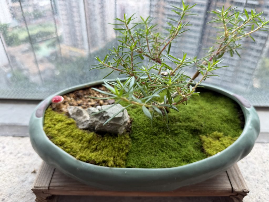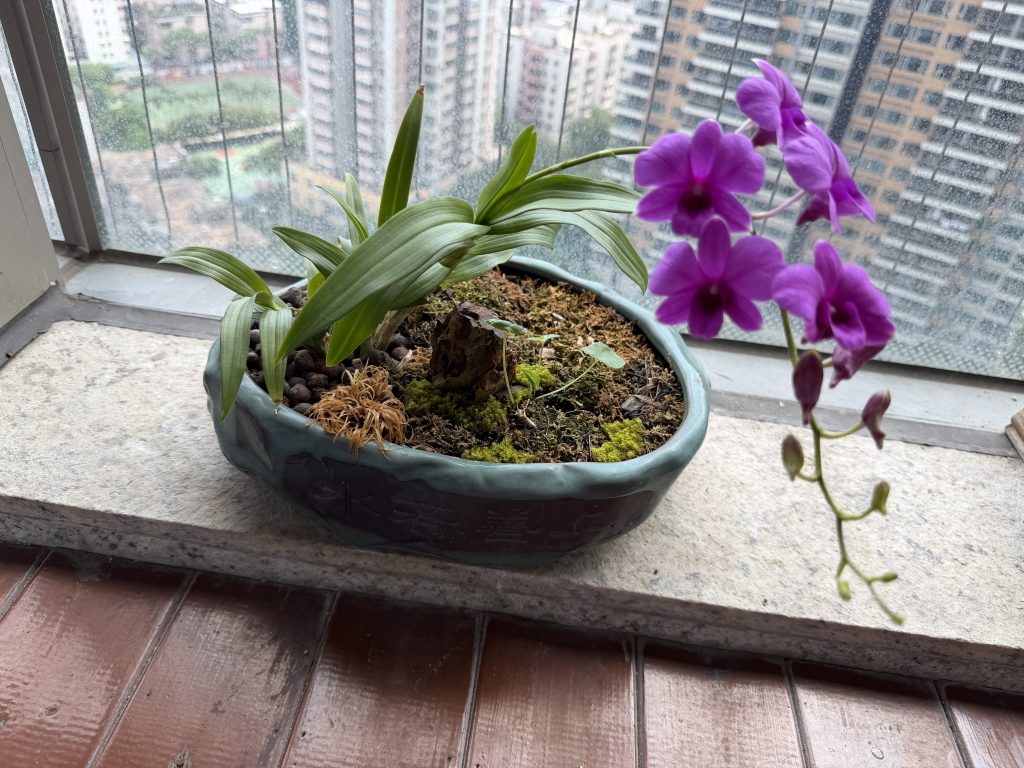 周六起早,心血来潮把阳台的盆栽整了下,给刚开花的石斛兰盆栽移植多一株小圆叶草,重新把青苔铺好做点缀。