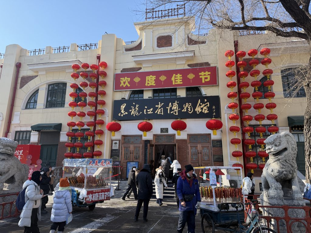 6、2月11日周三,早上逛了黑龙江博物馆,博物馆原是旧时的商场,三层俄式建筑。空间比较小,展览也因为分布在不同楼层的关系比较割裂,展品不多。大小希吃串冰糖葫芦的功夫就逛完回酒店了。