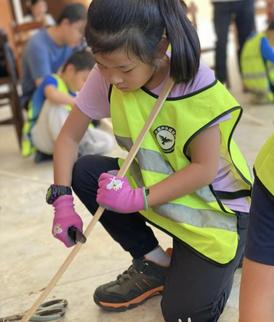 周六早上9点出发,驱车2小时才到达集合地点吕田镇,午饭后小朋友们学用刀具和矿泉水瓶自己制作弓箭和鱼笼。看小朋友们用刀,爸妈们个个心惊胆战,恨不得亲自上手。