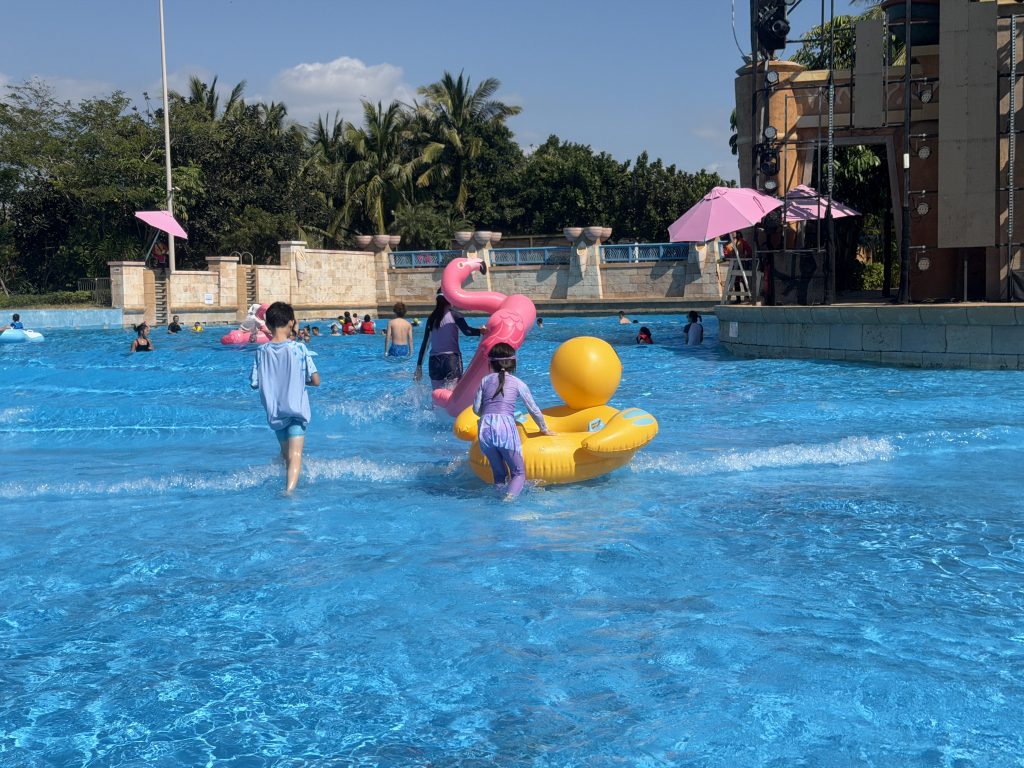 老父亲陪着小希玩了两趟漂流,全程双手连扒带划,第二天全身酸痛。大希自己带着表弟各种玩,我陪着小希和她堂弟们在造浪池玩,一个中午玩下来累趴,大人们连拉带赶才把小妖们扯回房间换洗。