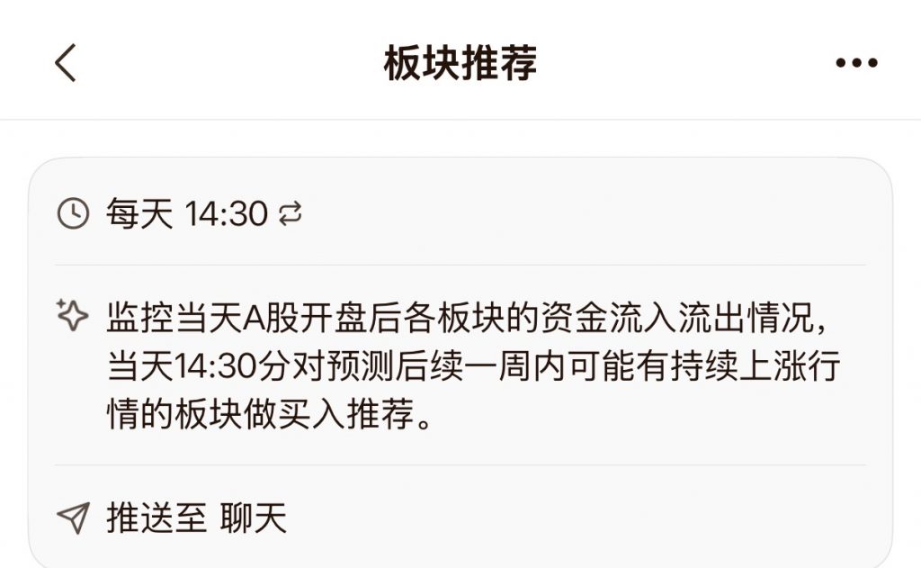 反而是“任务”让我惊喜,尝试让它每天早上给我推送“前一天资金净流入前十ETF”等任务,还挺方便。