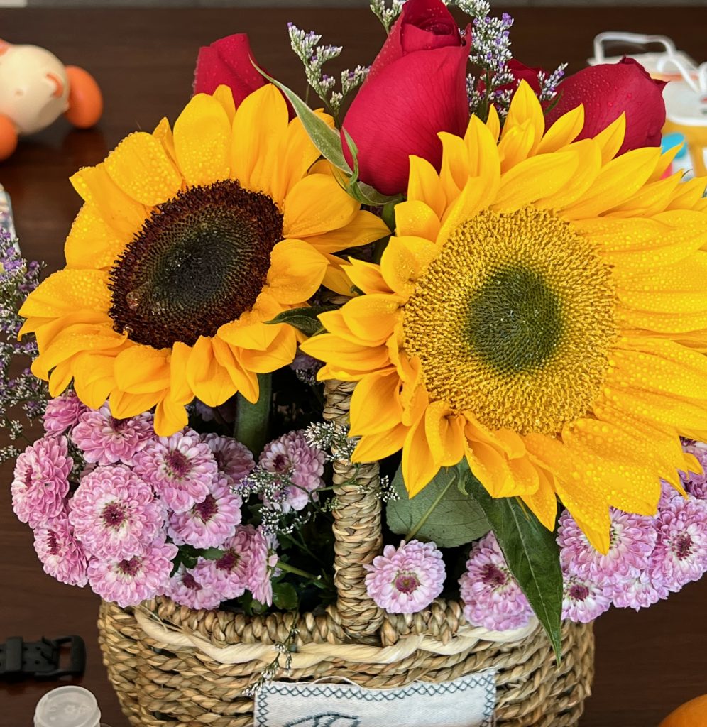 上周末老婆买的花蓝花都枯萎了,老婆看着花蓝里面花泥还比较完整,特意买了一捧鲜花回来,2个人七手八脚下重新给花蓝插出了鲜艳的花朵。